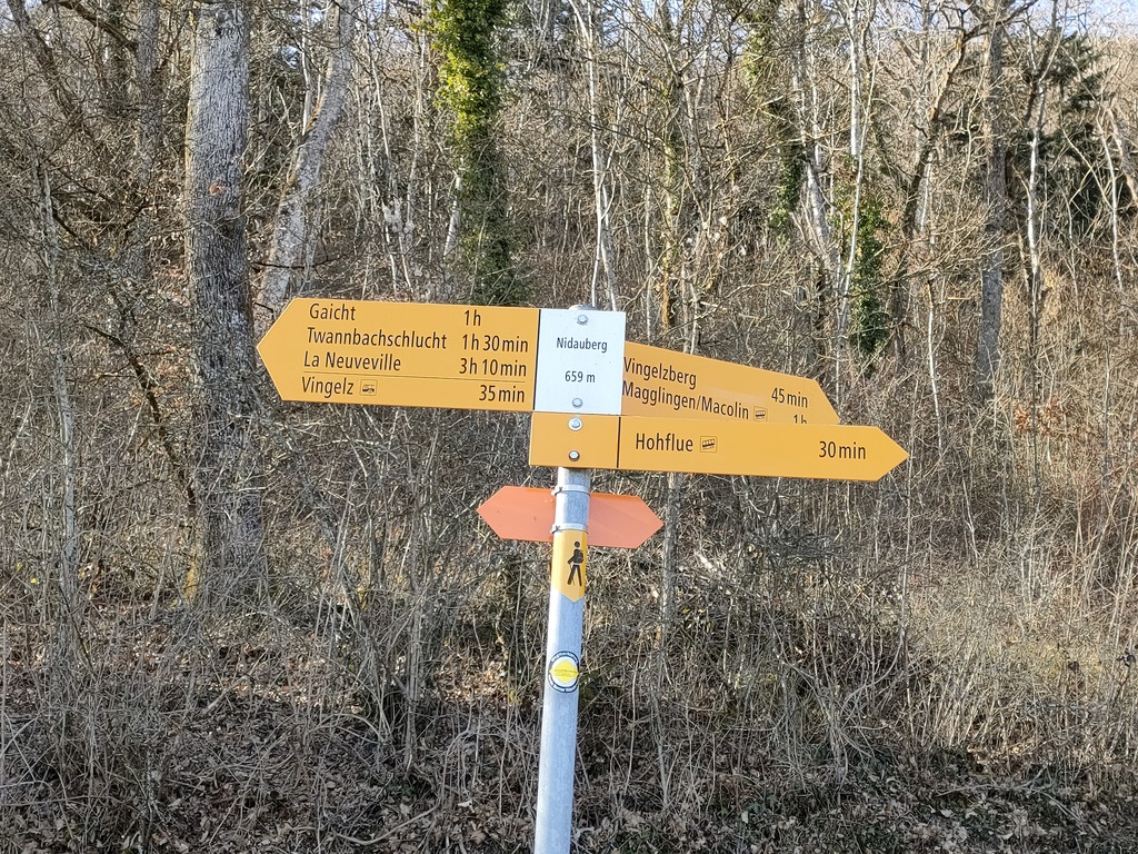 Ich fahre in Vingelz zum Parkplatz hoch.Von da folge ich dem Rebenweg bis zur Taubenlochschlucht. Hier führt der Rebenweb noch ein Stück weiter, aber endet oberhalb der Kirche Ligerz am Waldrand.