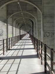 In einer Bahnunterführung stehen Pferde dicht an dicht am Schatten und ich habe keine Alternative, wenn ich nicht umkehren will.